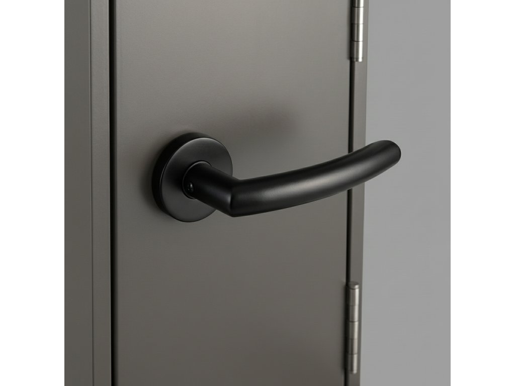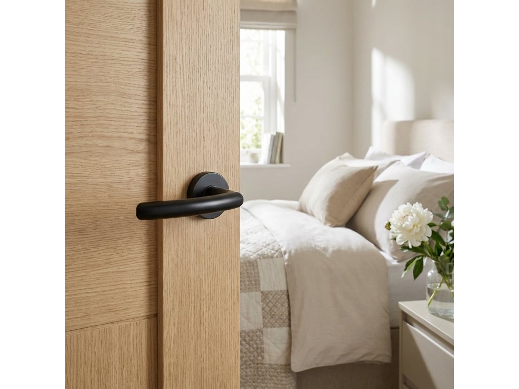 Nerezové kování v povrchové úpravě černá nerez, na plastové podrozetě s vratnou pružinou s výstupky pro lepší fixaci ve dveřích, rozety se montují skrz dveře proti sobě. Průměr rozet Ø51mm.